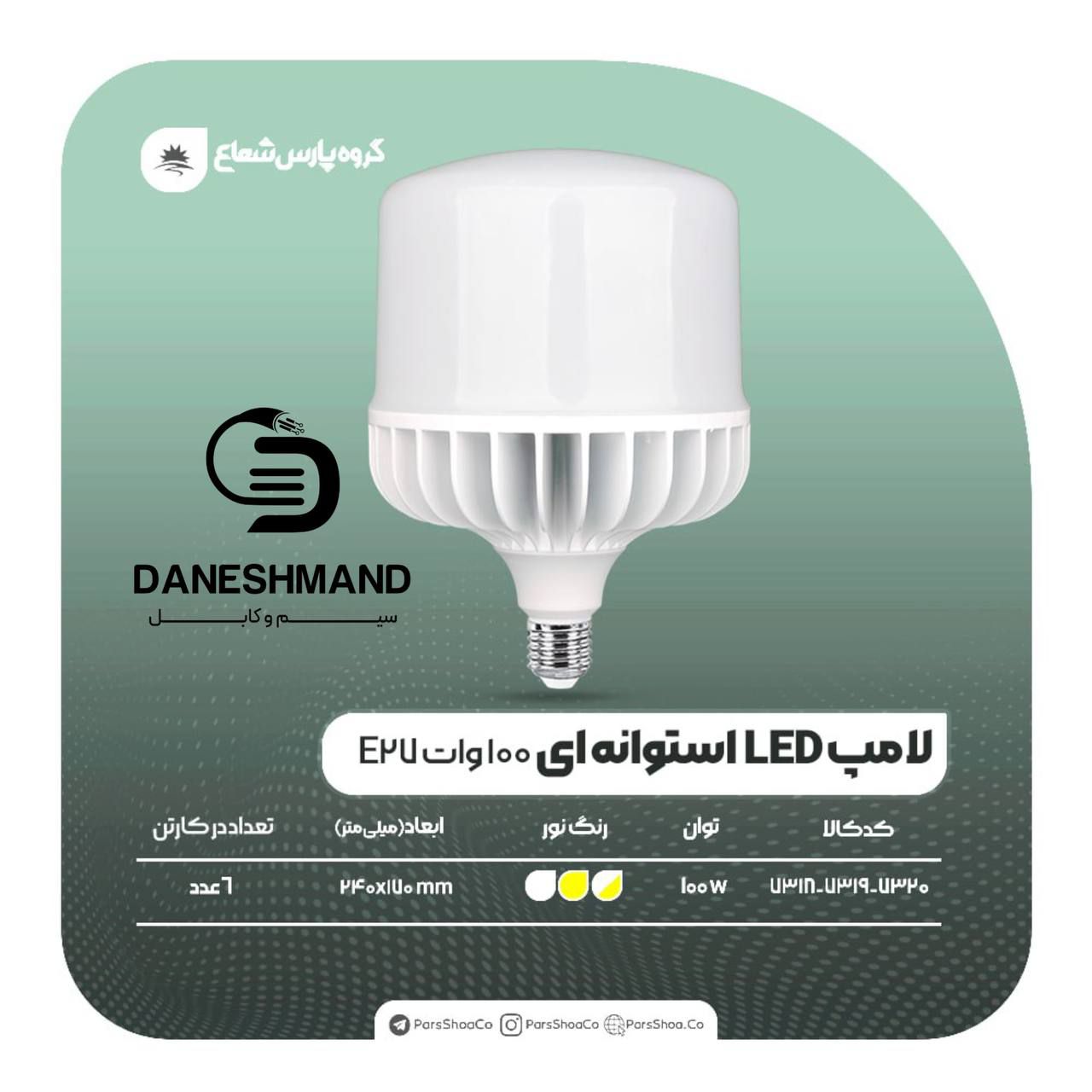لامپ 100 وات استوانه پارس شعاع توس